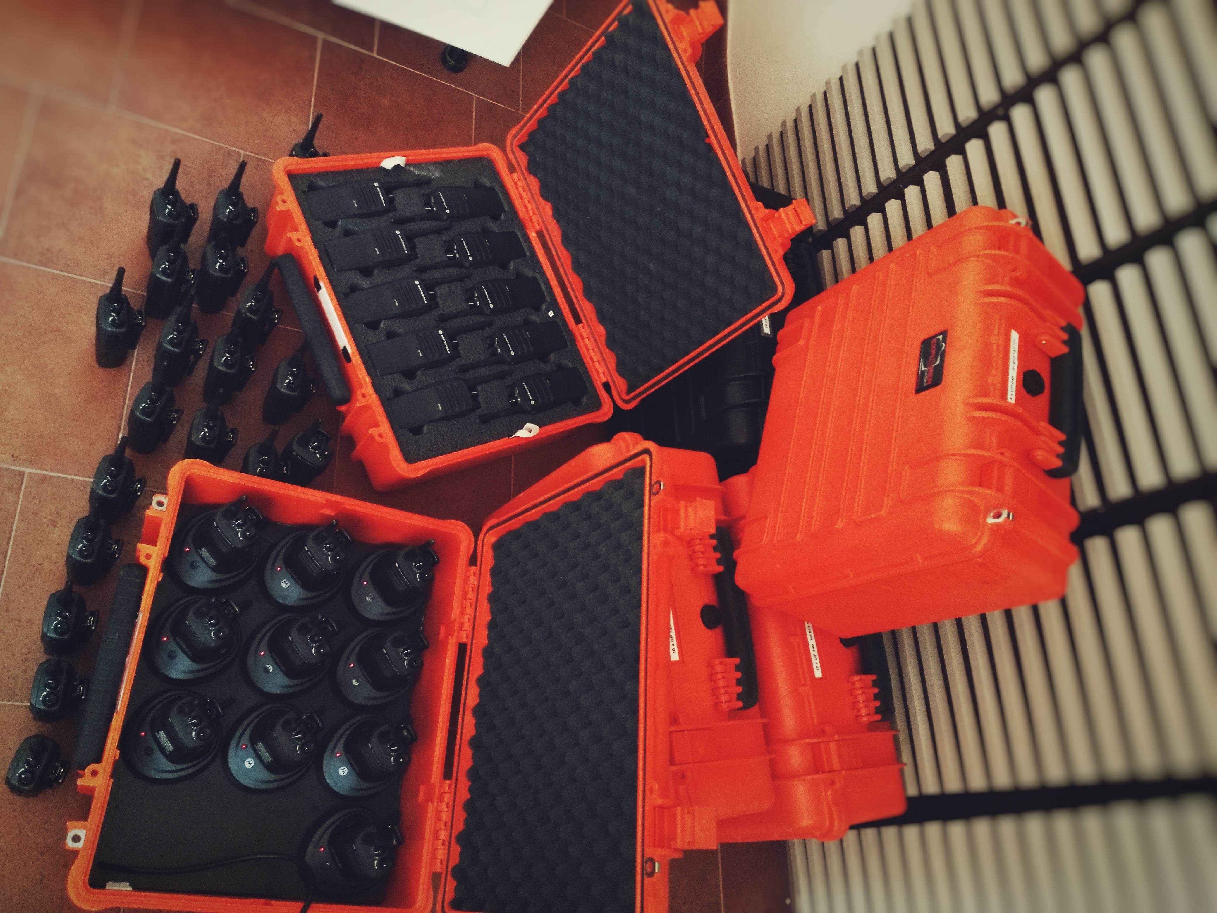 Vysilačky dodáváme v odolných kufrech Explorer case po 10 ks s nabíječi.